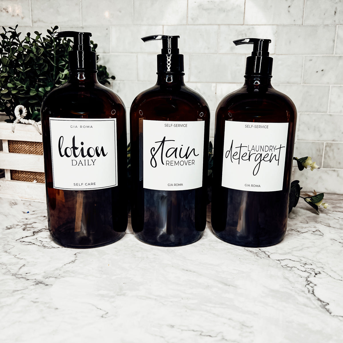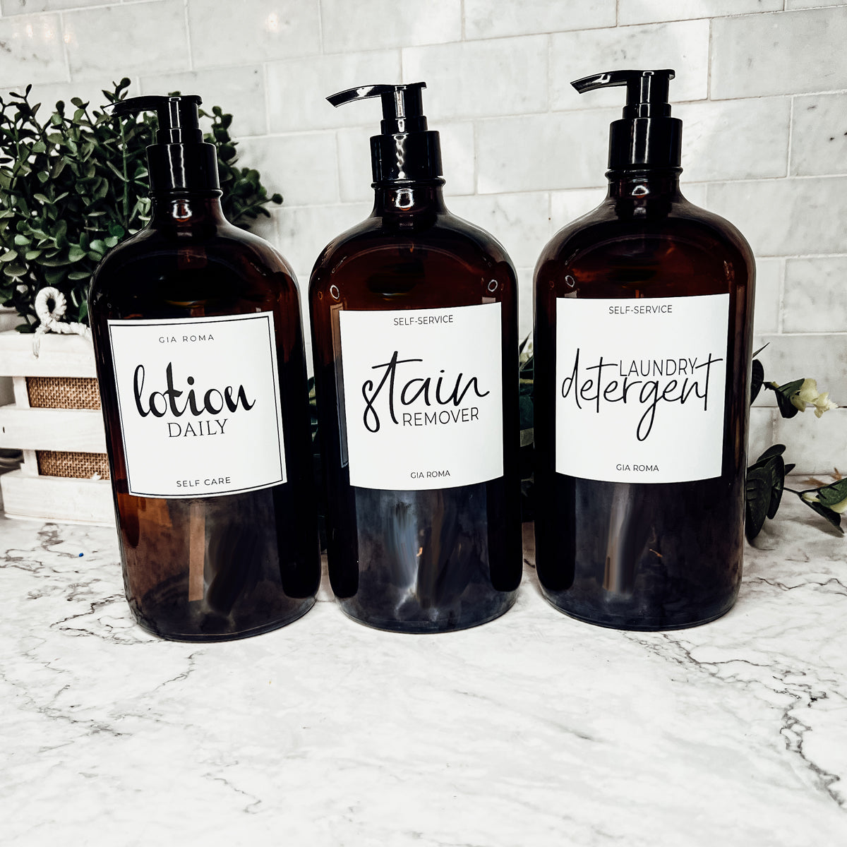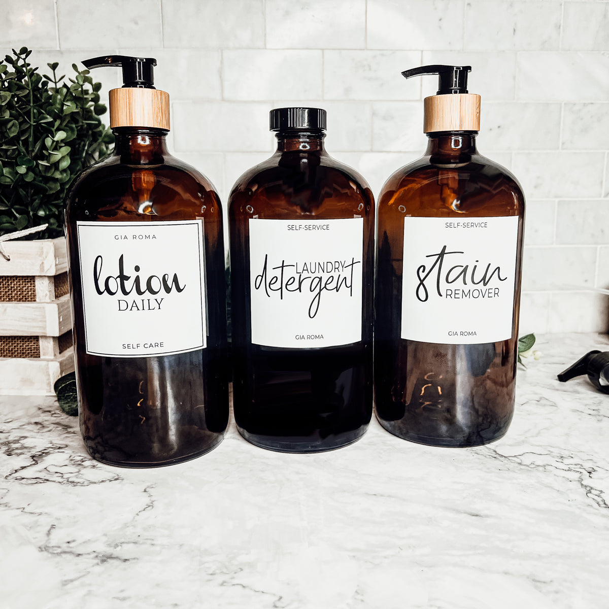 These reusable amber dispenser bottles combine function and farmhouse‑friendly style — durable glass that looks clean on display and performs behind the scenes. They’re ideal for DIY soap, mouthwash, hand wash, bulk shampoo, or concentrated laundry formulas. Labels (black or white waterproof) let you customize and keep things tidy at a glance.