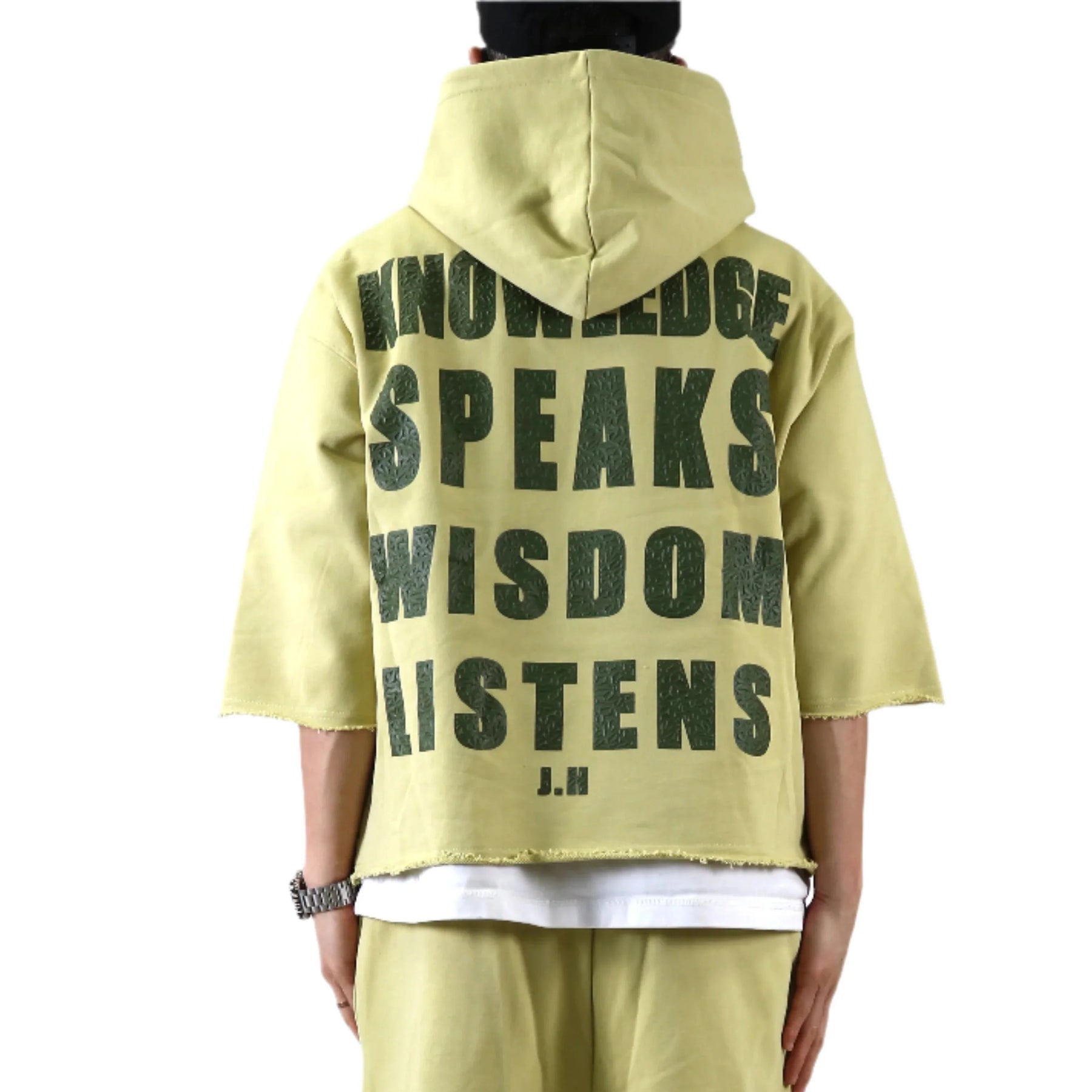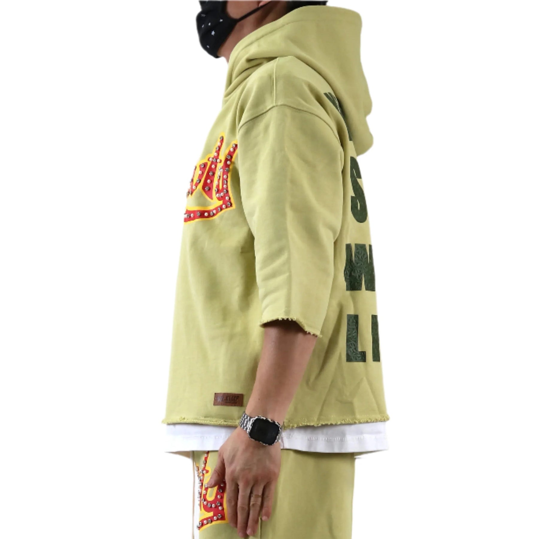 Solid French Terry 3/4 sleeve Crop Top Pullover Hoodie Drop Shoulder/Boxy Fit. Cropped Length. 3/4 Sleeve Mixed Crystal Clear & Silver Studs Front Print Designed by L.T.K Imported.