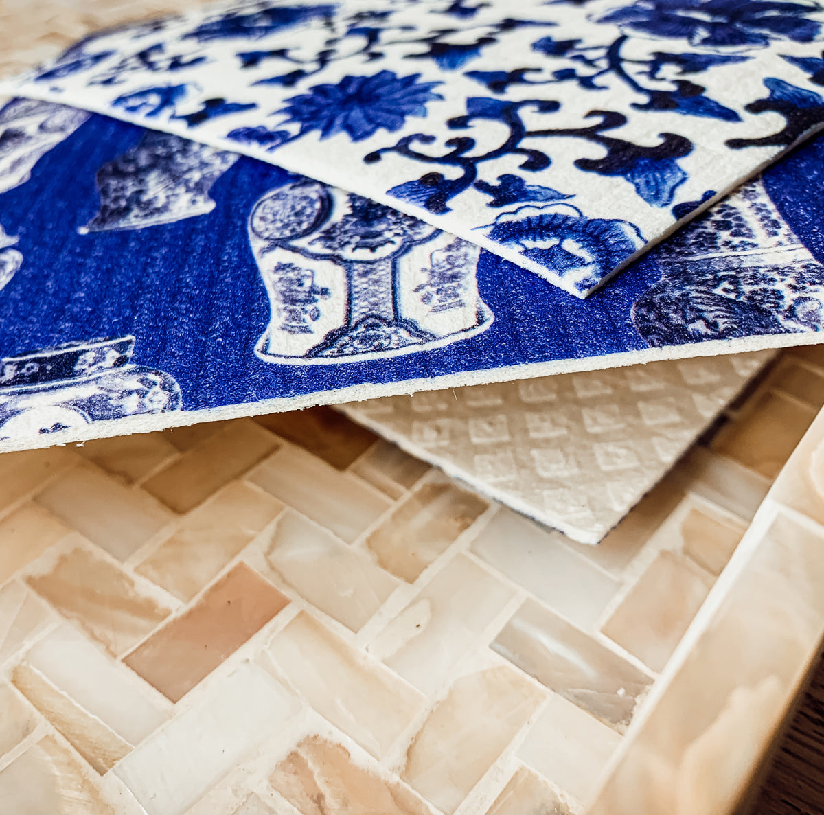 Three elegant Chinoiserie designs: Patterned styles that hide stains better than plain cloths and upgrade your sink area without sacrificing function.