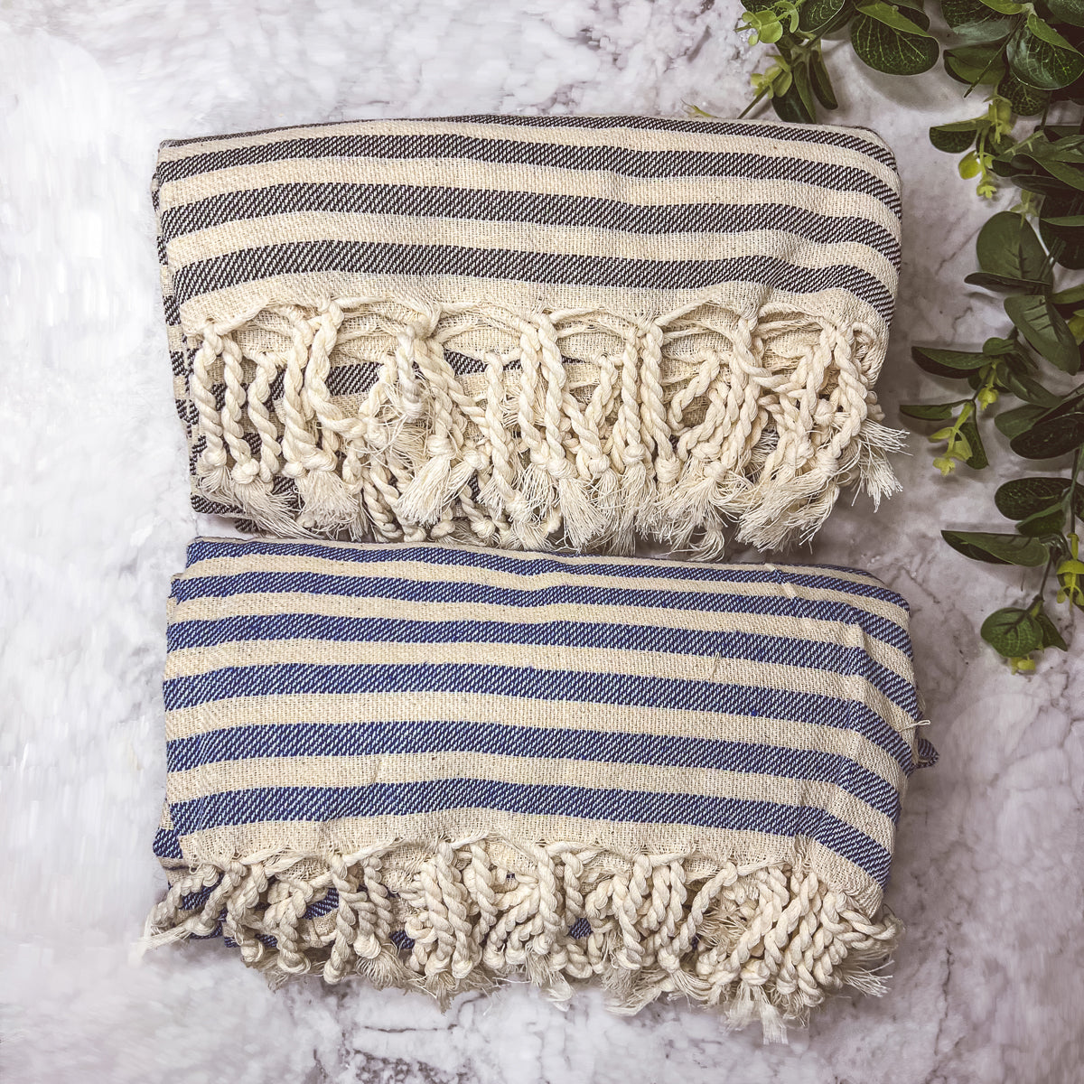 Lightweight nautical Turkish towel (peshtemal) that doubles as a beach towel, travel wrap, or decorative throw — designed for quick-dry convenience and everyday style. Oversized at about 40 x 70" with classic blue or grey stripes and tassel trim, it’s a versatile, low-bulk alternative to bulky bath towels.