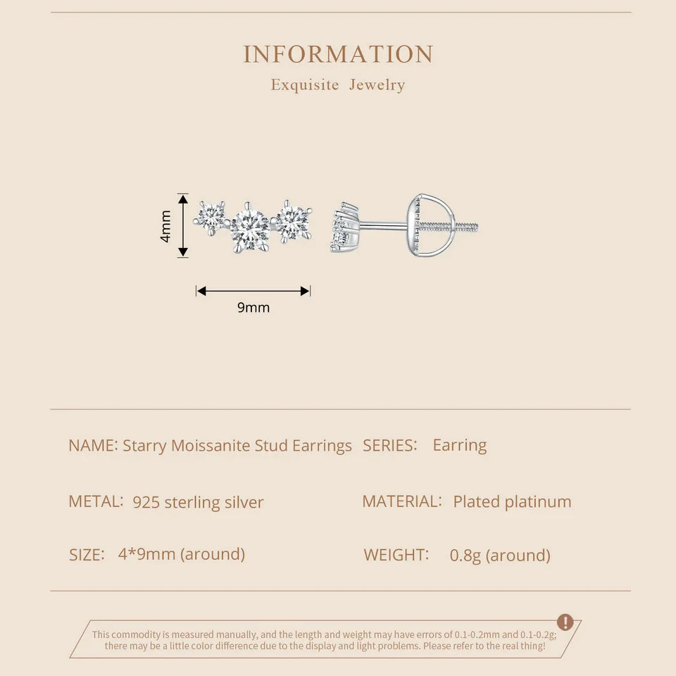 Delicate star-shaped moissanite studs crafted in genuine 925 sterling silver—perfect for everyday sparkle or a sentimental engagement gift. These lightweight, comfortable screw-back earrings offer diamond-like brilliance and reliable wear for special moments or daily style.