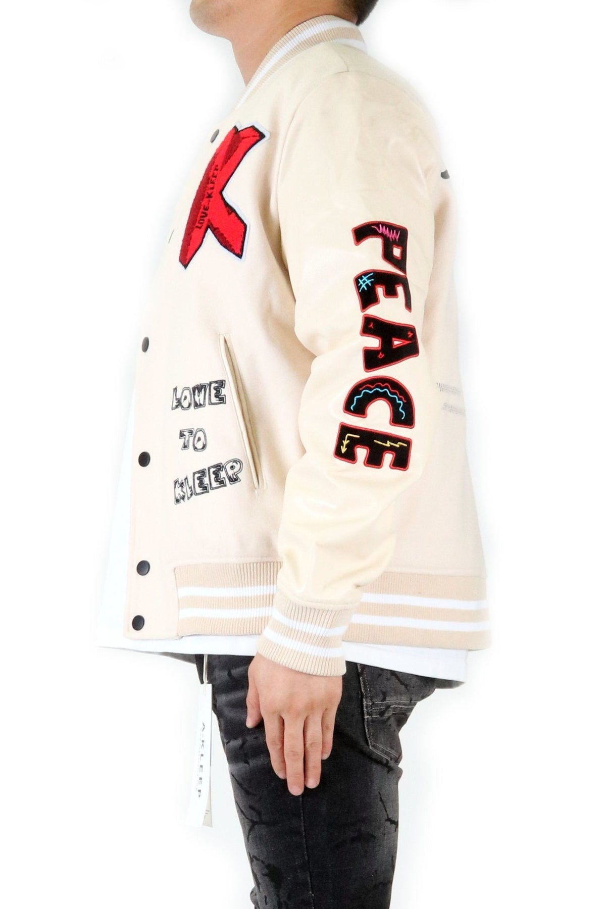 Men's premium melton body with faux leather sleeve Padded melton body with vintage faux leather sleeve Chenille letter patch and direct embroidery artwork Embroidery and print details on backside Model 5'10''. Wears Medium Top & 32 Bottom Love to Kleep / Love Yourself Imported. Designed by KLEEP