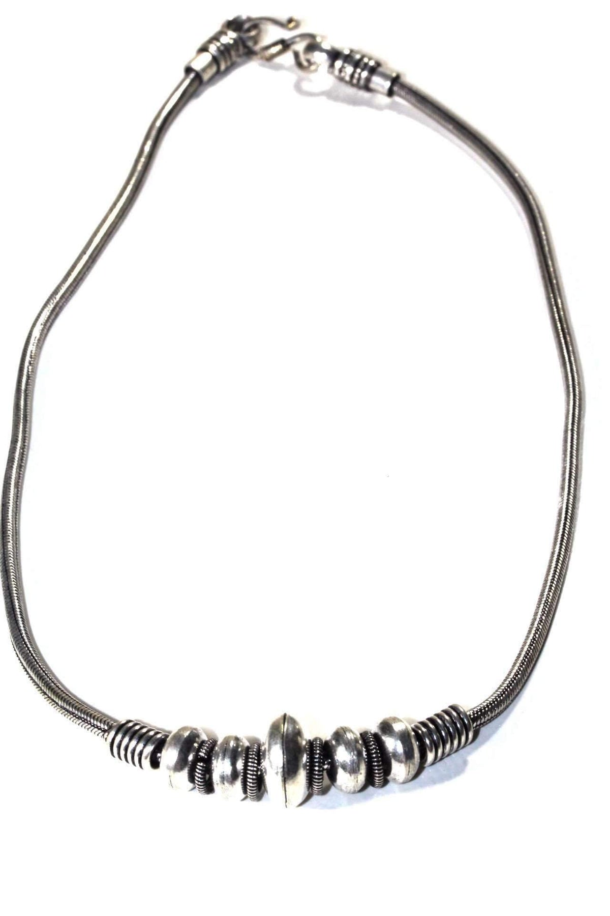 The Warrior Tribal Necklace is a sleek, silver‑tone statement piece that blends rugged tribal charm with everyday comfort. A smooth snake‑style chain carries stacked disc and coil beads for a bold, masculine look that layers easily or stands alone as a focal accessory.