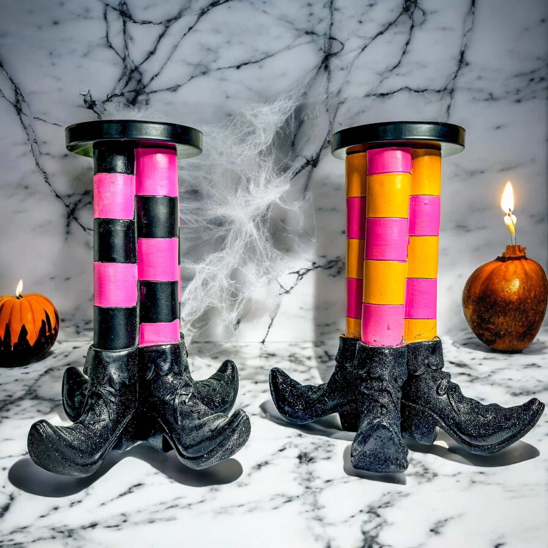 Eye‑catching Halloween accent: Striped stockings and glitter boots give instant seasonal charm, ideal for Halloween decor, party centerpieces, or a whimsical mantel display.