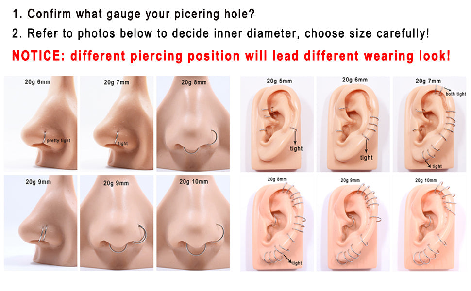 Sold individually Nose Hoop Ring/Earring Hoop ,Please choose your gauge and diameter hoop for your nose piercing needs.It has a smooth closure that doesn't slipped or opened. It's still tight after long-term use.