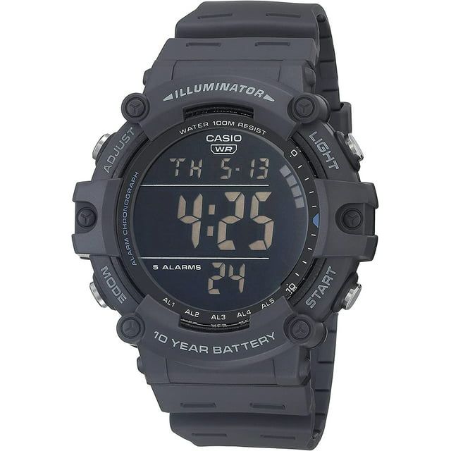 Case / bezel material: Resin Resin Band Resin Glass 100-meter water resistance LED backlight Dual time 1/100-second stopwatch Measuring capacity: 23:59’59.99’’ Measuring modes: Elapsed time, split time, 1st-2nd place times Countdown timer Measuring unit: 1 second Countdown range: 24 hours Countdown start time setting range: 1 minute to 24 hours (1-minute increments and 1-hour increments) Other: Auto-repeat 5 multi-function alarms (with 1 snooze alarm) Hourly time signal Full auto-calendar (to year 2099) 12/24-hour format Regular timekeeping: Hour, minute, second, pm, month, date, day Accuracy: ±30 seconds per month Approx. battery life: 10 years on CR2032 Case diameter: 51mm Case thickness: 15mm Band width: 27mm Large 52mm Resin Case Resin Strap with Buckle Closure Water Resistant to 100 Meters 10-Year Battery Life LED Backlight with Afterglow Dual Time 1/100-Second Stopwatch Countdown Timer 5 Multi-Function Alarms Hourly Time Signal Full Auto-Calendar 12/24 Hour Format