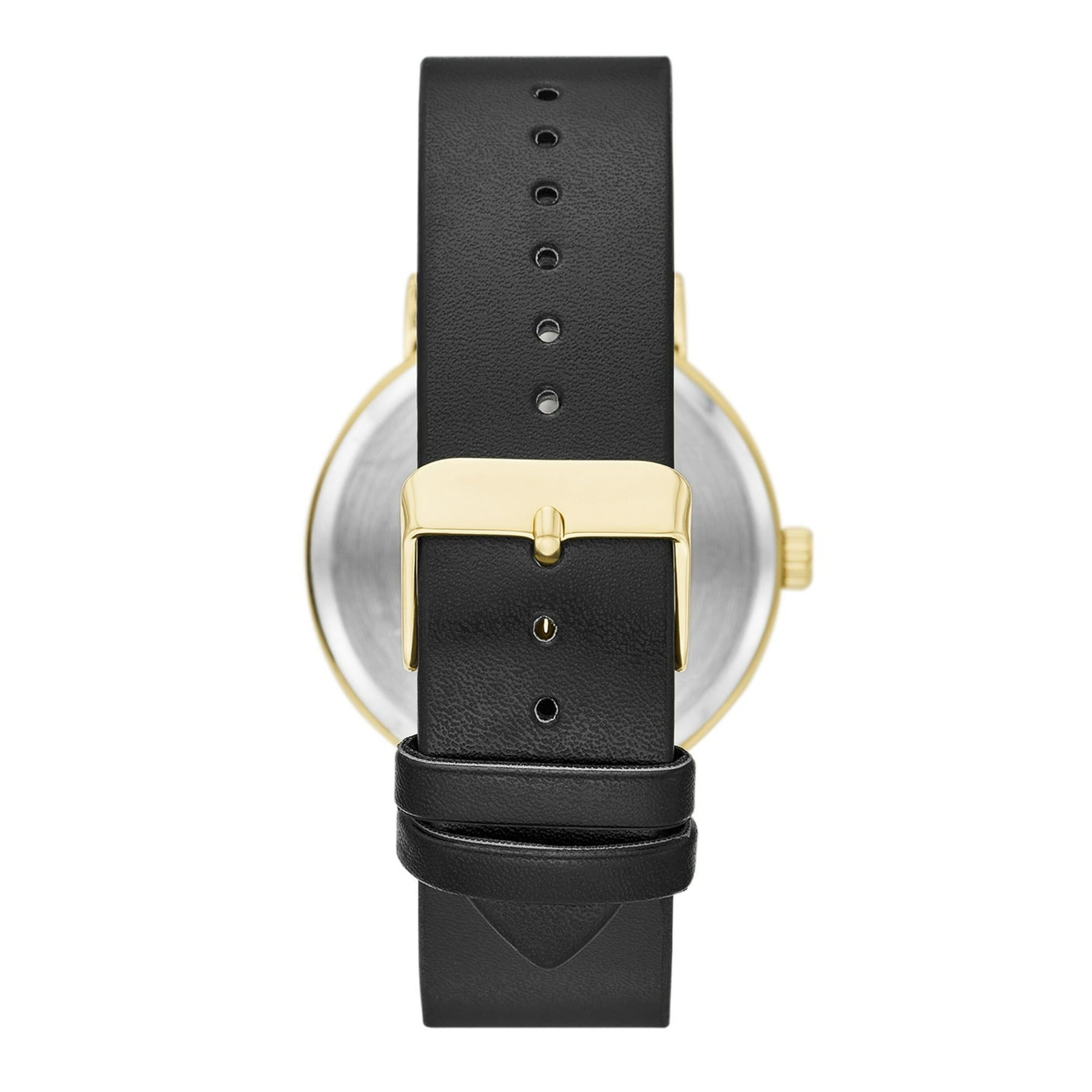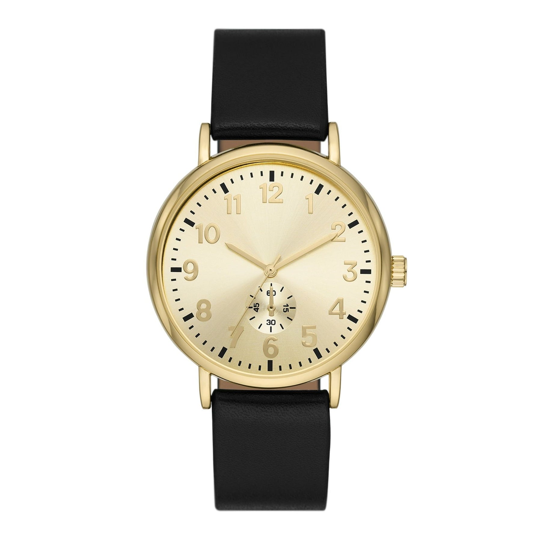This minimalist George gold and black wristwatch is the perfect timepiece. It is versatile enough to go from work to weekend. The clean and modern simplistic face is matched with a slim gold-tone case and smooth black faux leather band. This sharp looking timepiece is a must for the season. Every gentleman deserves a stylish timepiece like this. Easy Read Dial Long Life Battery Quartz Analog Movement Smooth Vegan Leather Band 41MM Watch Case Diameter
