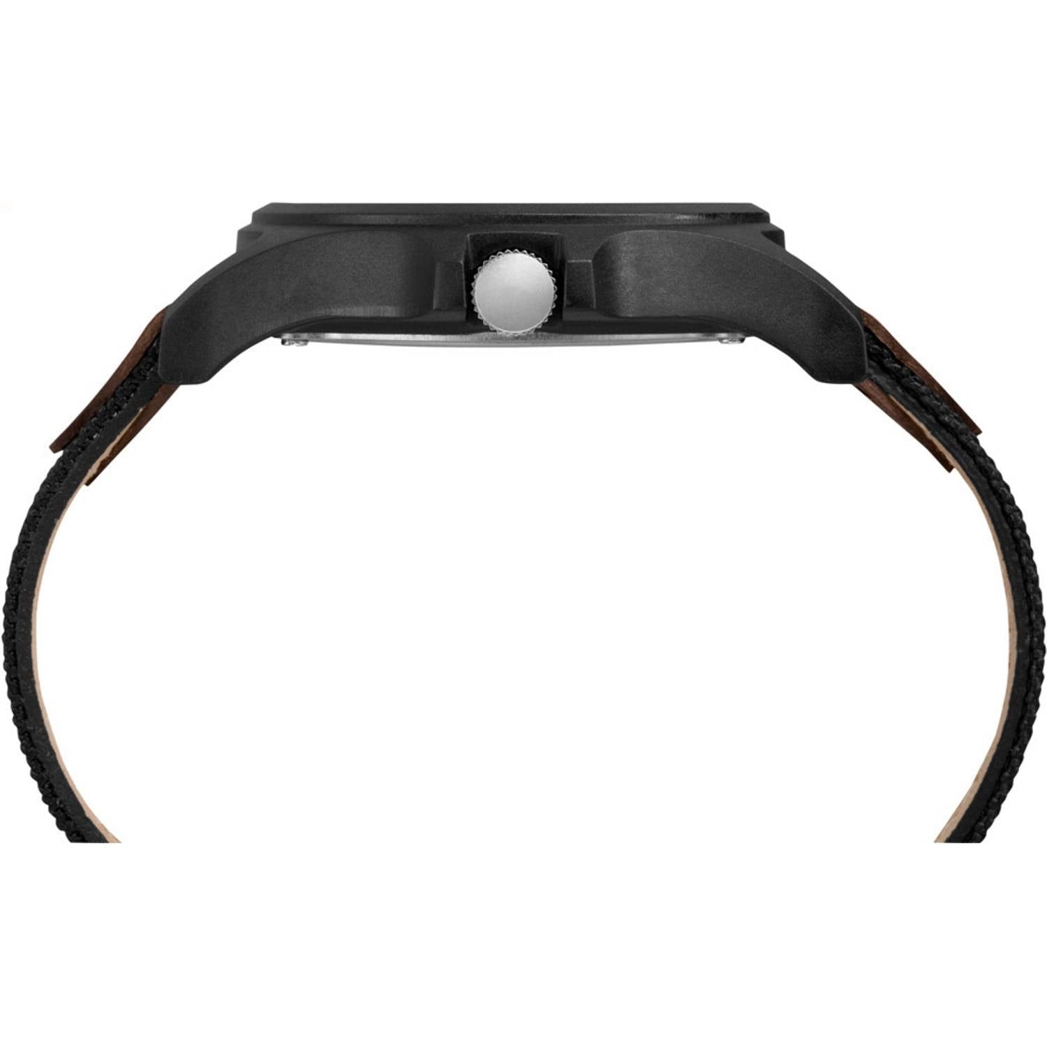 Pack light with this outdoor classic. This rugged resin case and 50 meter water resistant watch with mixed nylon and leather strap is weather and adventure ready. Adjustable black & brown 20mm genuine leather & fabric strap fits up to 8-inch wrist circumference Black dial with full Arabic numerals; date window at 3 o'clock; 24-hour military time Durable black 40mm resin case with acrylic crystal Indiglo light-up watch dial; luminous hands Water resistant to 50m (165ft: in general, suitable for short periods of recreational swimming, but not diving or snorkeling