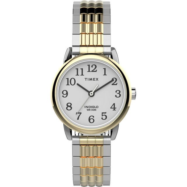We took a modern approach to our classic 1977 Easy Reader® watch with refined modern touches to its two-tone case, easy-to-read white dial on our easily-adjustable Perfect Fit two-tone stainless-steel expansion band—bringing together simplicity and effortless style. Perfect Fit self-adjustable two-tone 12mm stainless steel expansion band fits up to 7.5-inch wrist circumference White easy-to-read dial with black full Arabic numerals Two-tone 25mm brass case with mineral glass crystal Indiglo light-up watch dial Water resistant to 30m (100ft): in general, withstands splashes or brief immersion in water, but not suitable for swimming or bathing