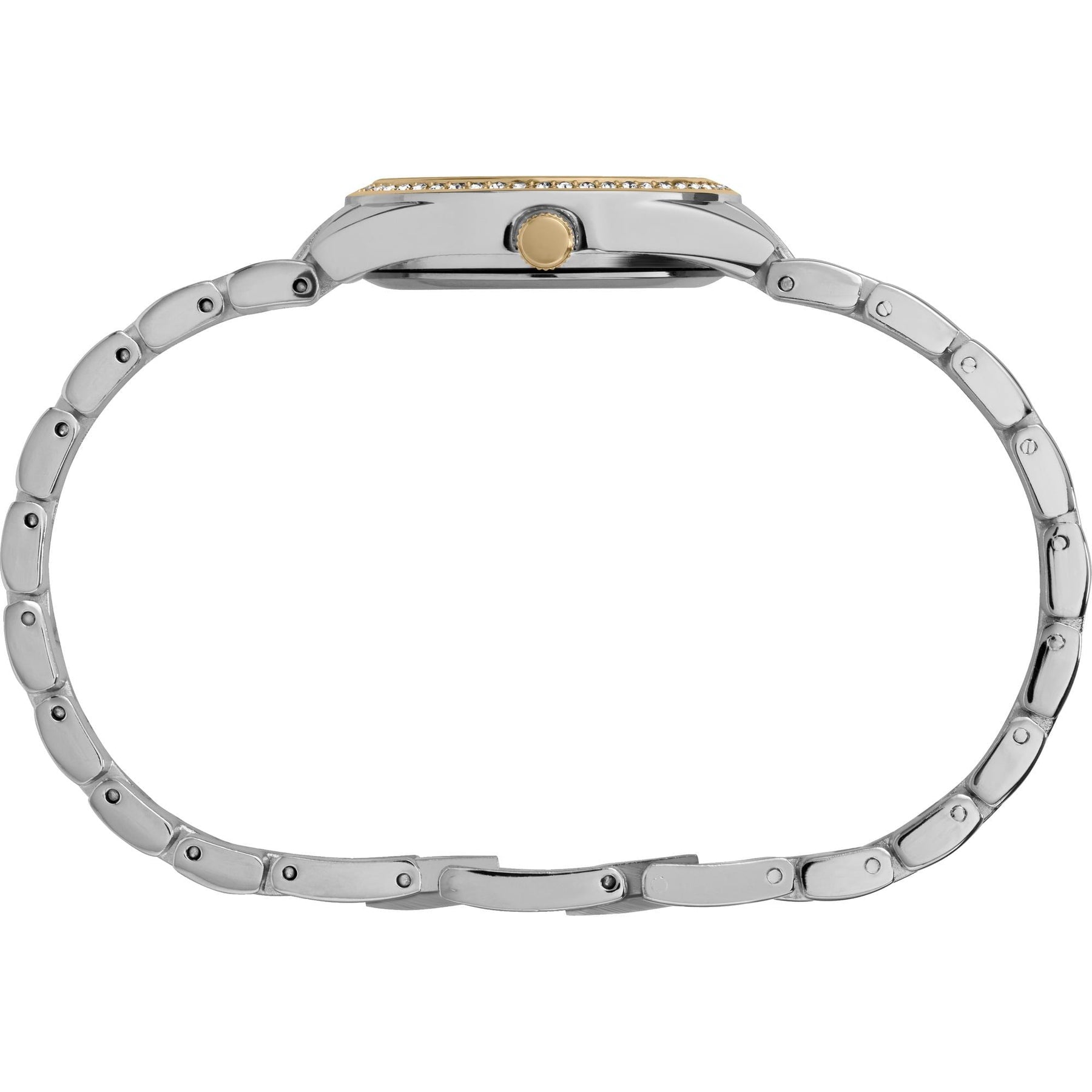 Accessorize your outfit with this elegant Viewpoint by Timex watch featuring a two-tone case and bracelet with a detailed mother-of-pearl dial. The gold-tone Arabic numerals are flanked by crystals for a stylish look. Two-tone 13mm stainless steel bracelet fits up to 7.5-inch wrist circumference Mother-of-Pearl dial with gold-tone partial Arabic numerals & gold-tone hands Silver-tone 30mm metal case with mineral glass crystal Crystal embellished gold-tone bezel Water resistant to 30m (100ft): in general, withstands splashes or brief immersion in water, but not suitable for swimming or bathing