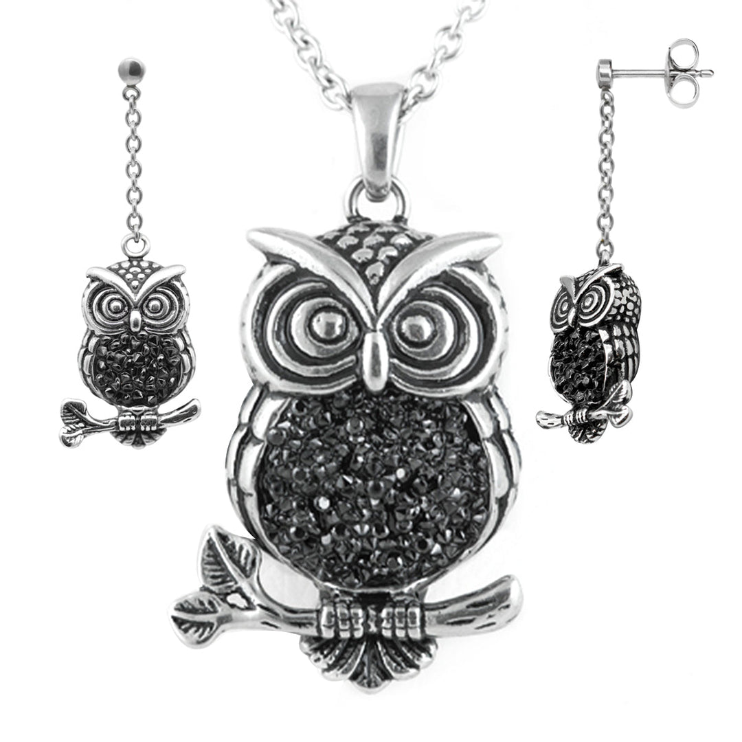 Owl Pendant Necklace And Dangle Earrings With Crystals