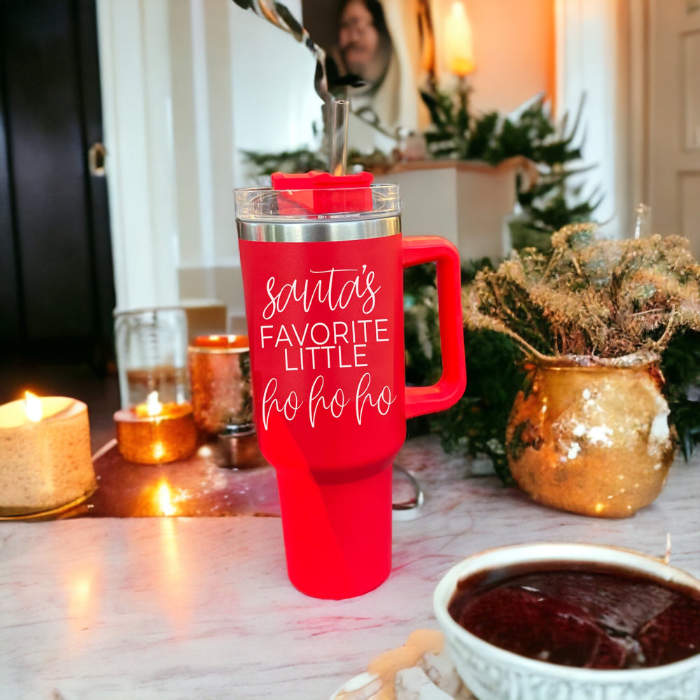 Celebrate the season with a cheeky, high-capacity 40oz insulated tumbler that keeps drinks hot or cold for hours while showing off a festive "Santa's Favorite Little Ho Ho HO" design. This travel-ready stainless steel mug with handle, lid and straw is perfect for holiday parties, road trips, or everyday sipping—comfort, capacity, and a little holiday humor in one.