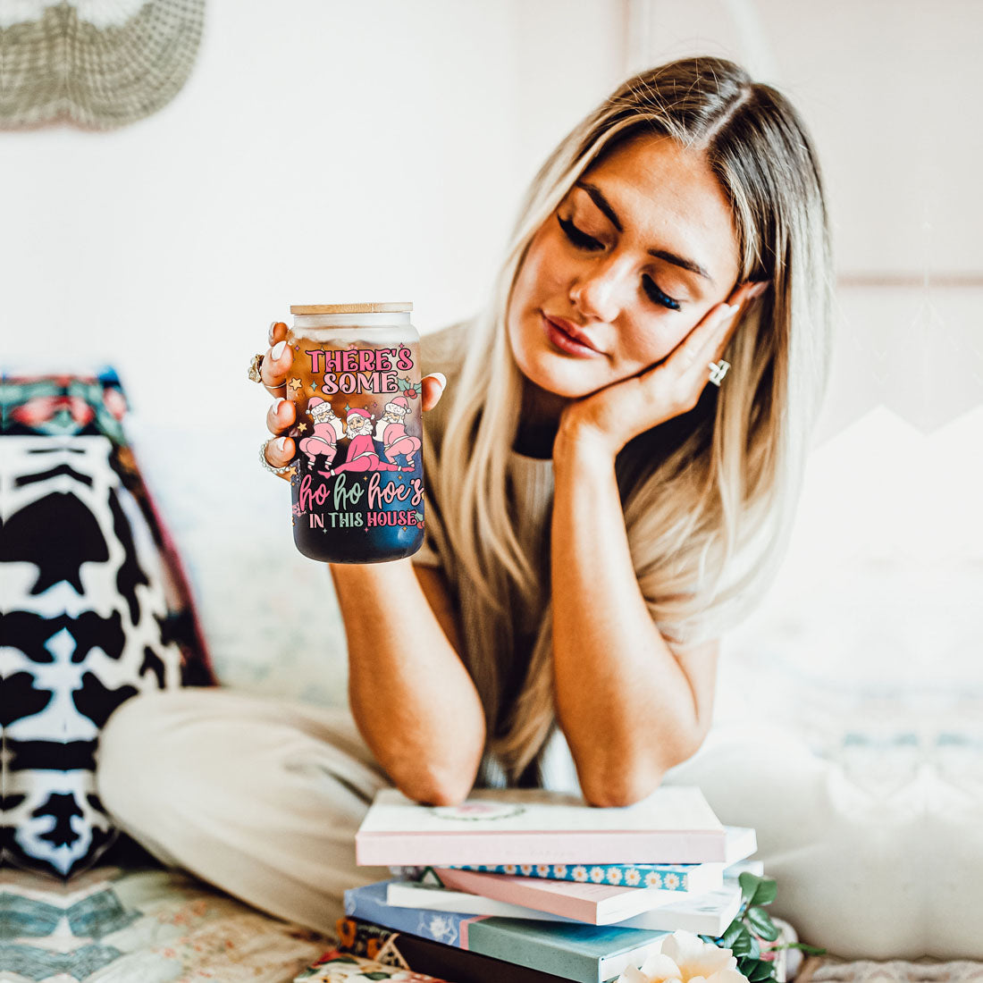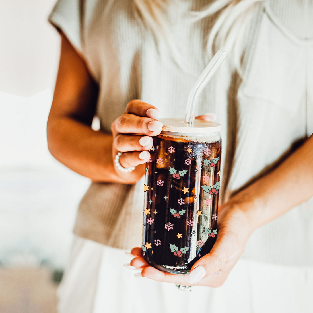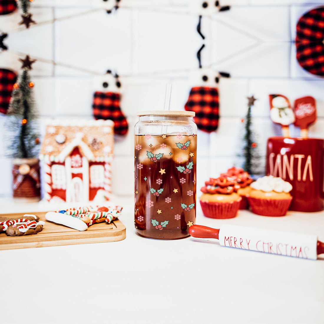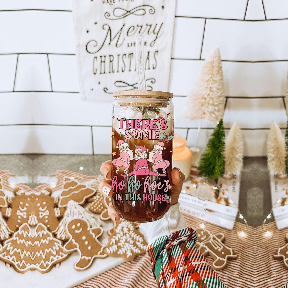 This cup blends holiday humor with practical design: lightweight yet sturdy borosilicate glass, a natural bamboo lid for a stylish touch, and reusable glass straws that feel great while cutting down waste. The full-wrap pastel print makes it a fun stocking stuffer or hostess gift — great for anyone who prefers their holidays on the naughty-but-nice side.