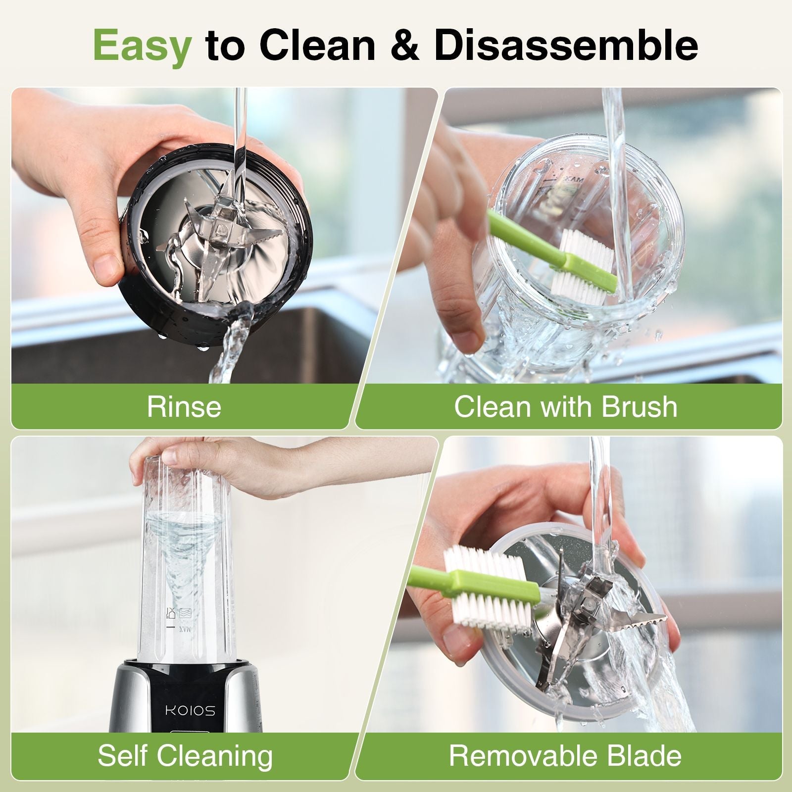 All-in-One Blender: This is KOIOS newly 2024 designed multi-function blender for smoothies, up to 1000W power motor and equipped with 2 sets of F ood-G rade 304 stainless steel blades, which can meet the needs of blending, mixing, grinding and crushing at the same time. Imagine that you can use the portable blender to grind coffee beans every morning, or make smoothies, milkshakes, juices and frozen drinks in seconds, and easily start to enjoy a healthier lifestyle.