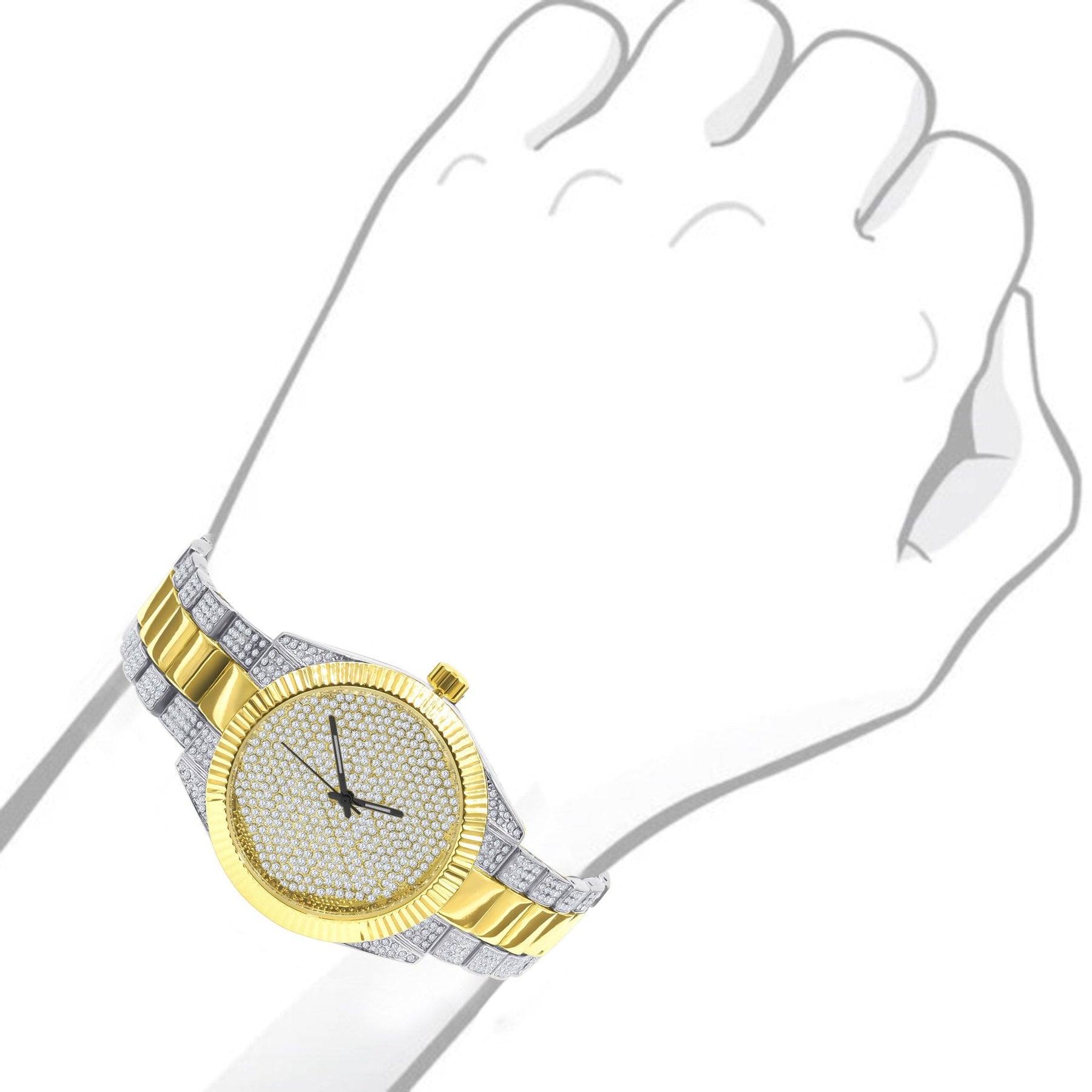 A dazzling 42mm stainless steel bling watch set with micro-pave cubic zirconia for a high-impact, jewelry-like look — perfect when you want your timepiece to double as a statement piece. It blends eye-catching sparkle with a solid metal bracelet for everyday wearability and confidence on the wrist.