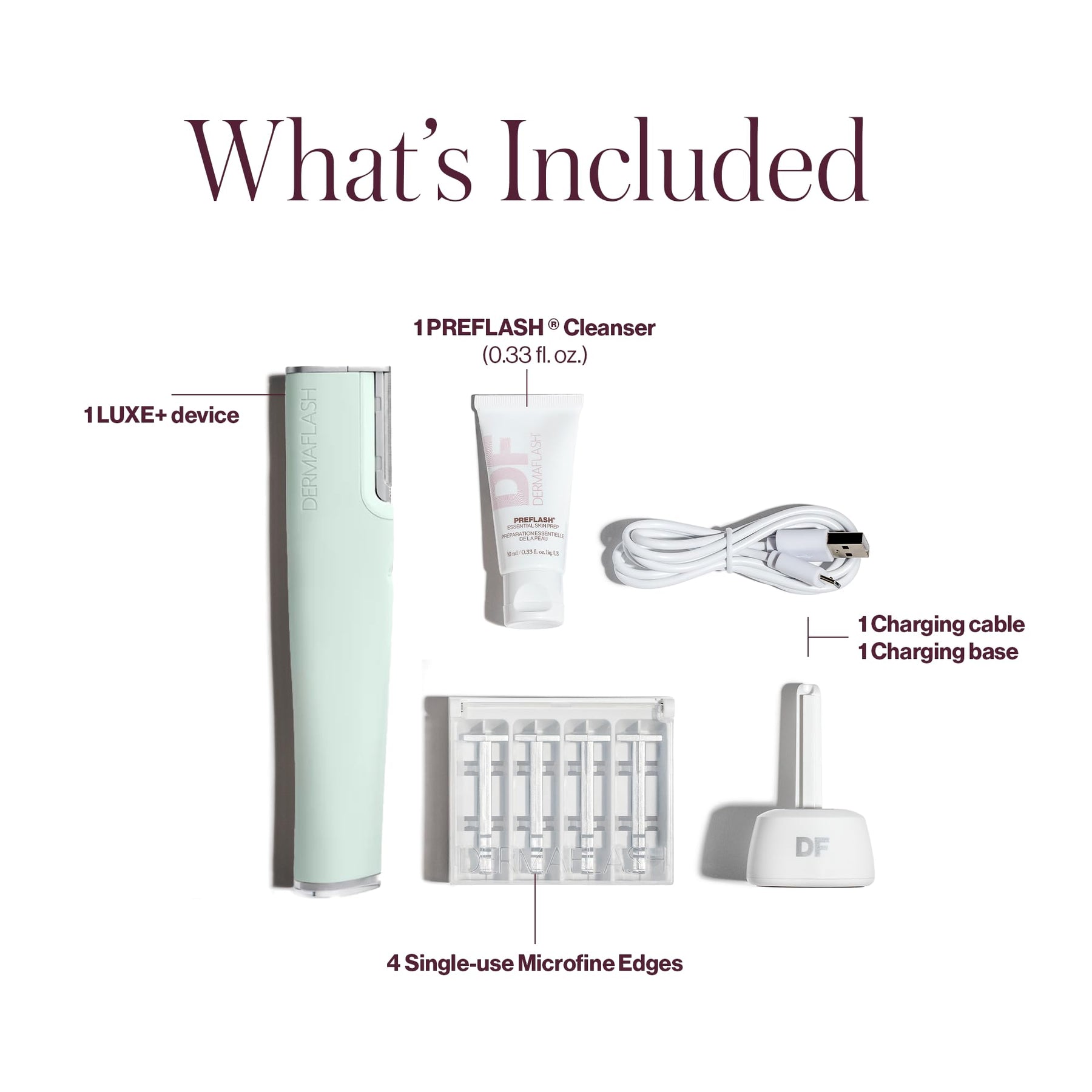 Kit contents + usage: Set includes LUXE+ facial exfoliator device, charging base, USB charging cable, 4 single-use Microfine Edge dermaplaning blades, and PREFLASH Essential Skin Prep facial cleanser (10 ml). To use, prep with PREFLASH and dry skin thoroughly. Hold at device at a 45° angle and glide over your face using short, feathery strokes.