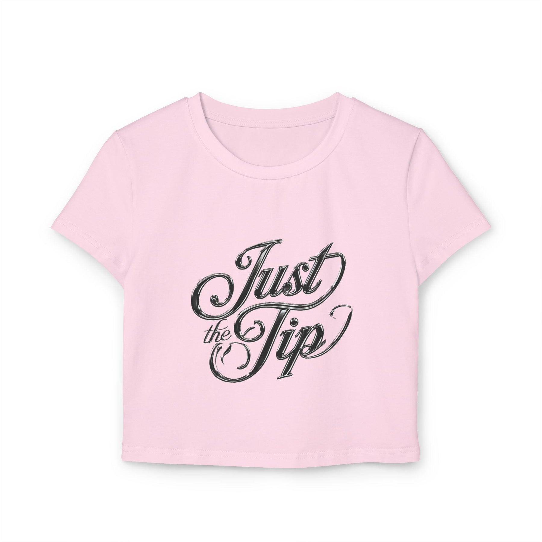 Available in sleek black or playful pink, this fitted top features bold, bright chrome text that reads "Just the Tip."
