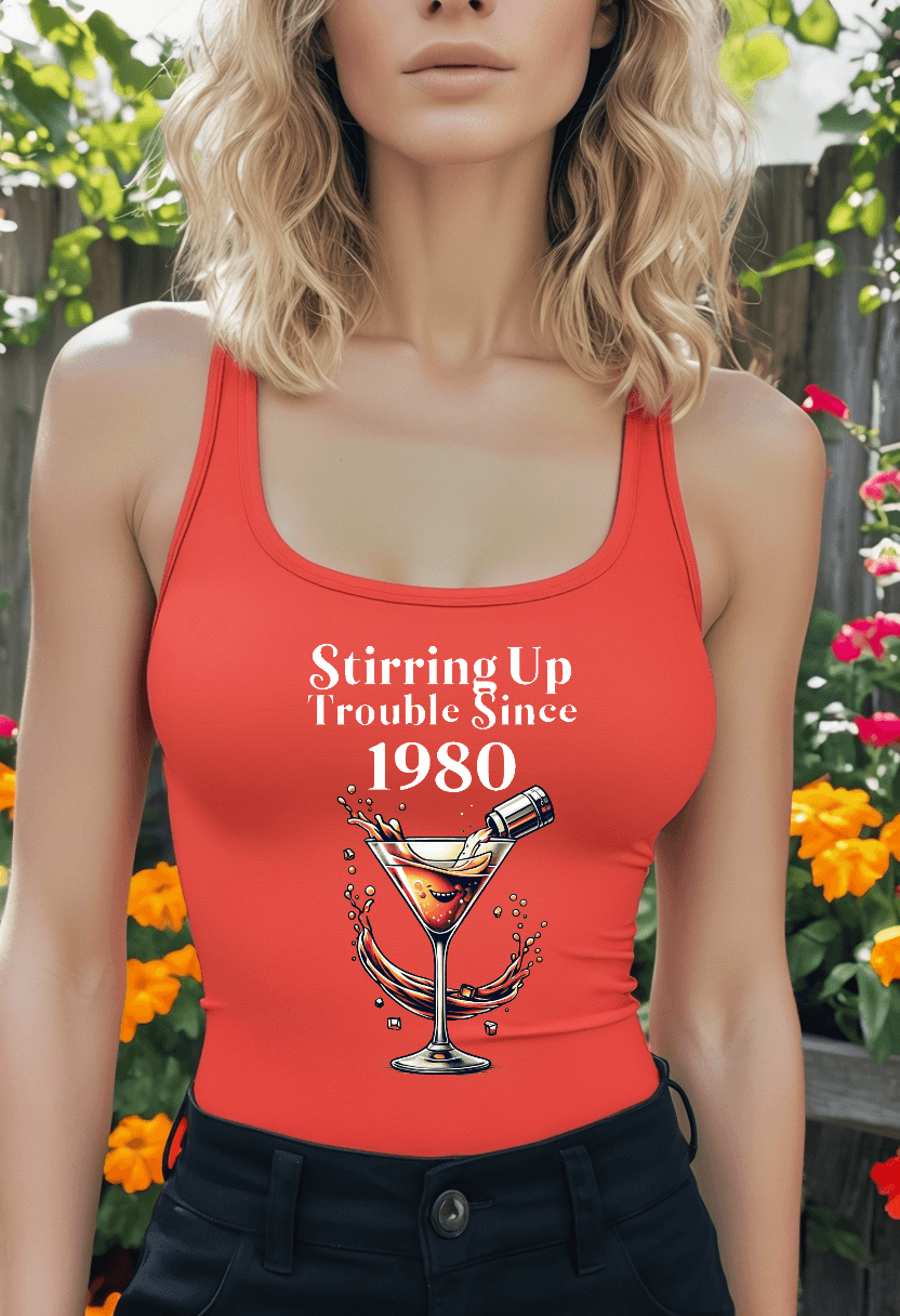 Featuring colorful text that says “Stirring Up Trouble Since (Year),” this top is customizable with the year of your choice, making it as unique as you are.