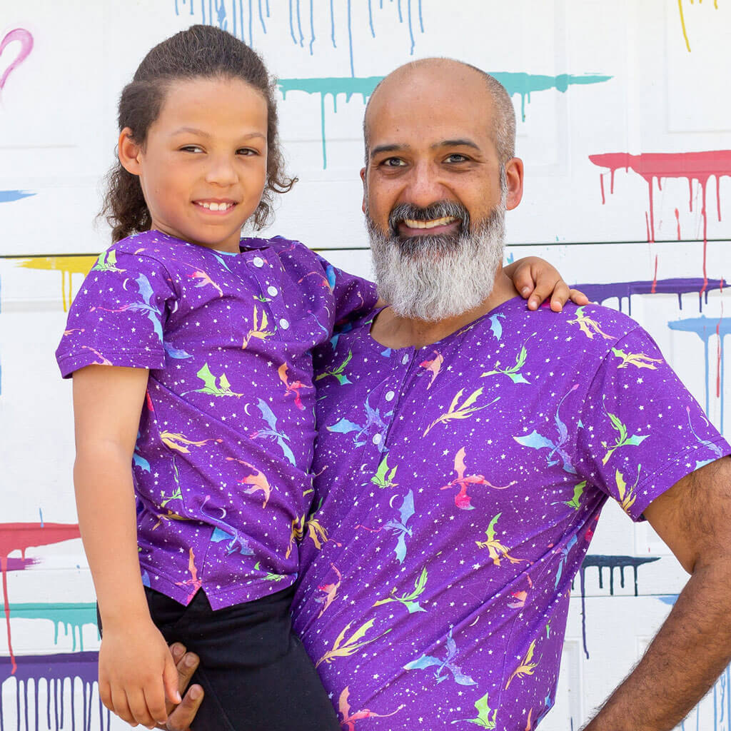 A fuchsia sky glimmers with stars as slim graceful dragons soar by in rainbow gradients. The constellations glow incandescently amid the spatters of starry galaxies. 3-button henley collar closure, made of 95% cotton/5% spandex for stretchy comfort.