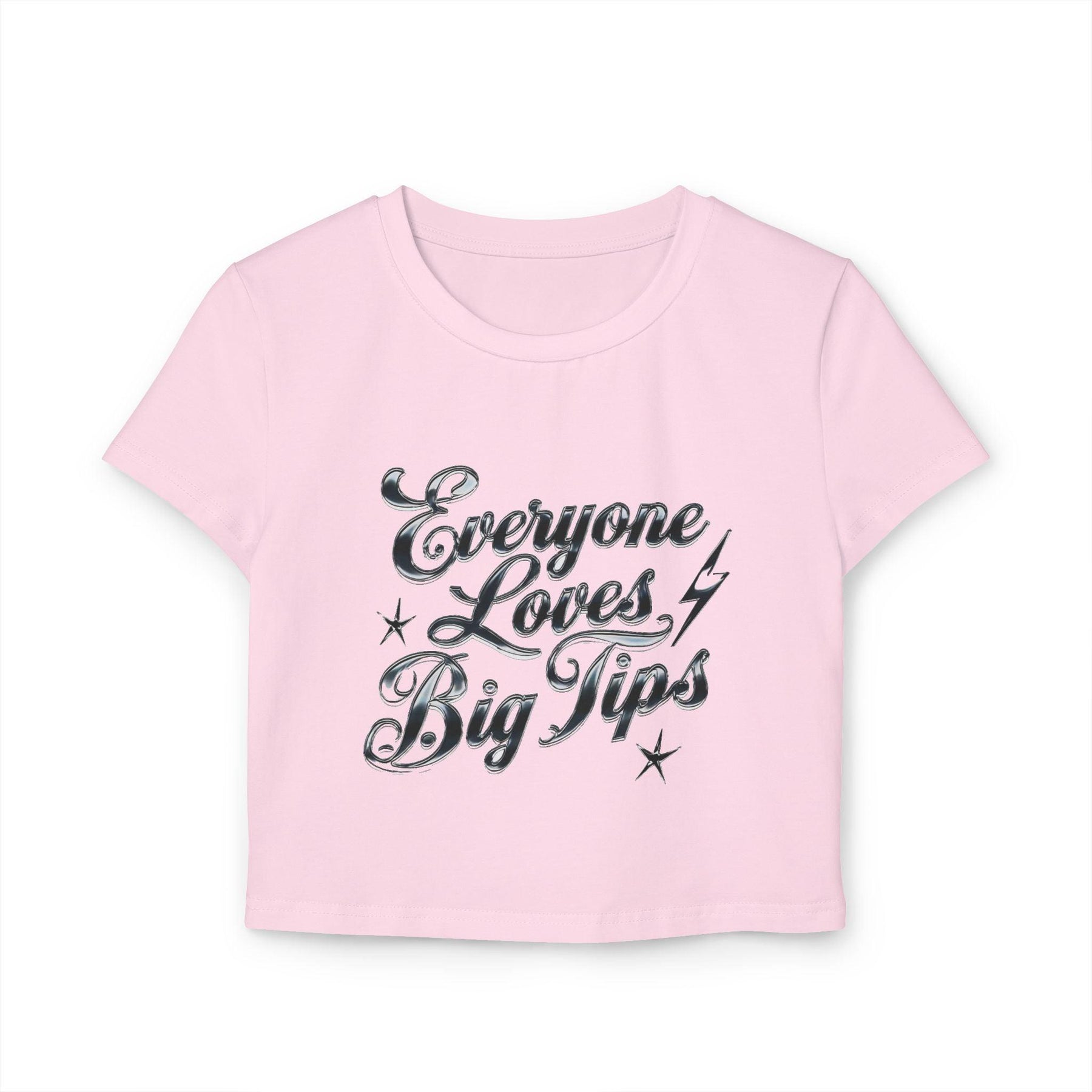 Available in sleek black or playful pink, this fitted top features bold, bright chrome text that reads "Everyone Loves Big Tips." Perfect for adding a touch of humor and attitude to your work wardrobe, this tee is sure to bring smiles—and maybe even bigger tips!