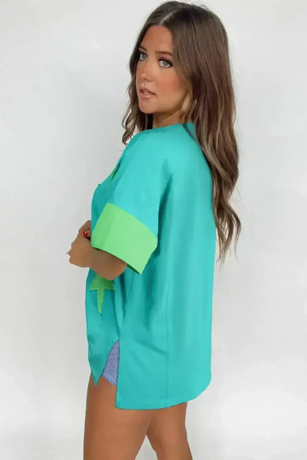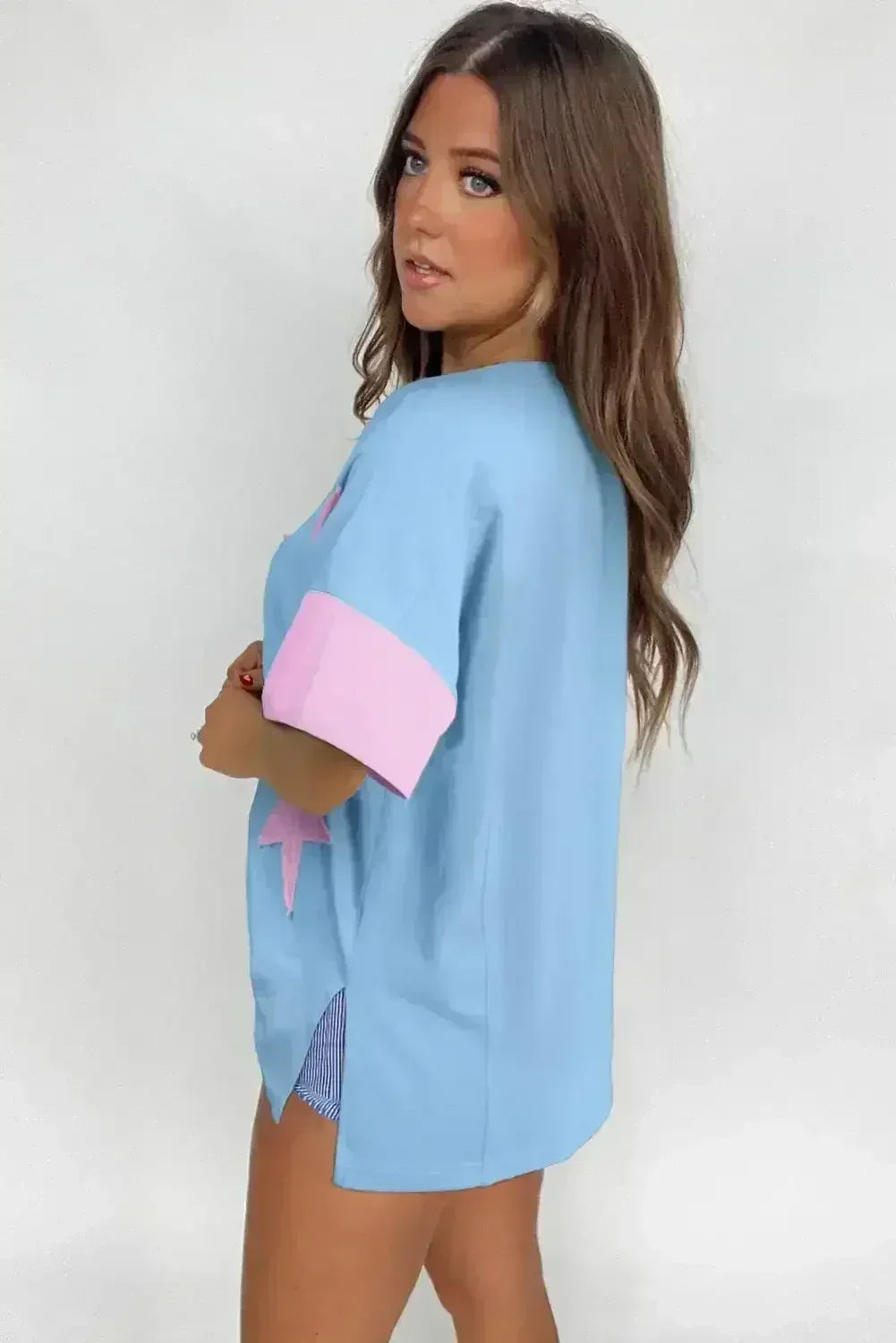 Featuring star patches on the front, this tee exudes a playful and youthful vibe, making it a fun and versatile addition to your wardrobe.