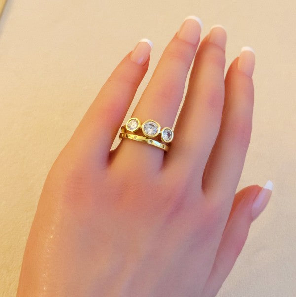 This trio bezel stone ring set of 2 features a classic and chic design, making it a lovely addition to any outfit. The set includes two rings that can be worn alone or together for a versatile and stylish look. Add a touch of elegance with this beautiful set. Dimensions: Size 7 18k gold platedΒ Lead and nickel free Imported