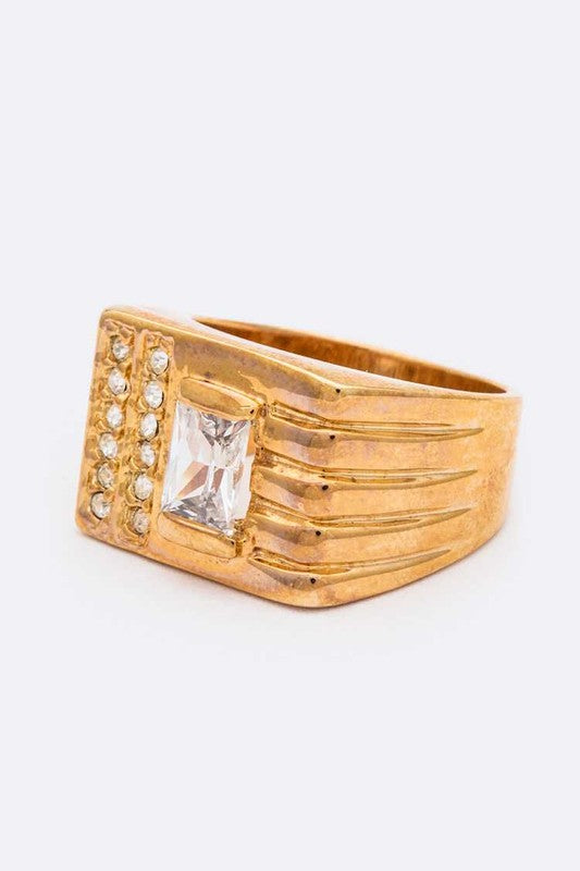 Textured Gold Band Ring With Cubic Zirconia Center Stone