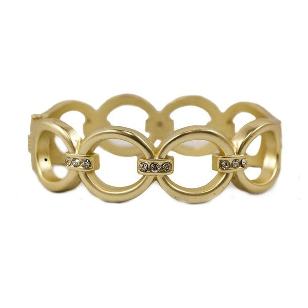 Matte gold oval links joined together with smaller links covered with pave rhinestones. Easy spring closure.* Color: Matte Gold* Width: 0.75\"* DxD: 2.5\"x 2\"* Brushed gold Plated* Spring Closure